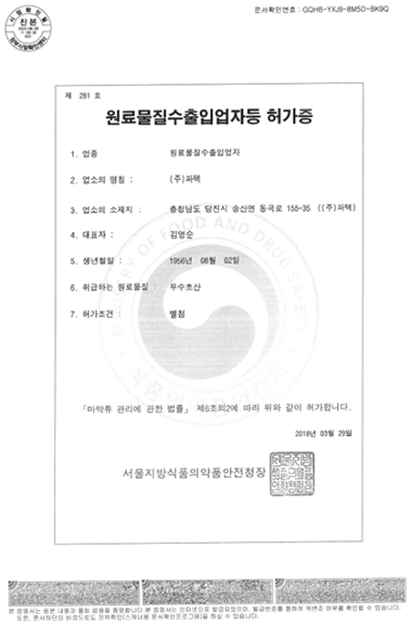 입력한 부정확한 정보로 인해 발생하는 사고의 책임은 이용자 자신에게 있으며 타인 정보의 도용 등 허위정보를 입력할 경우 (주)파텍 회원자격이 상실되거나 (주)파텍 홈페이지 이용이 정지될 수 있습니다. 이용자 개인정보와 관련한 아이디(ID)의 비밀번호에 대한 보안유지책임은 해당 이용자 자신에게 있습니다.